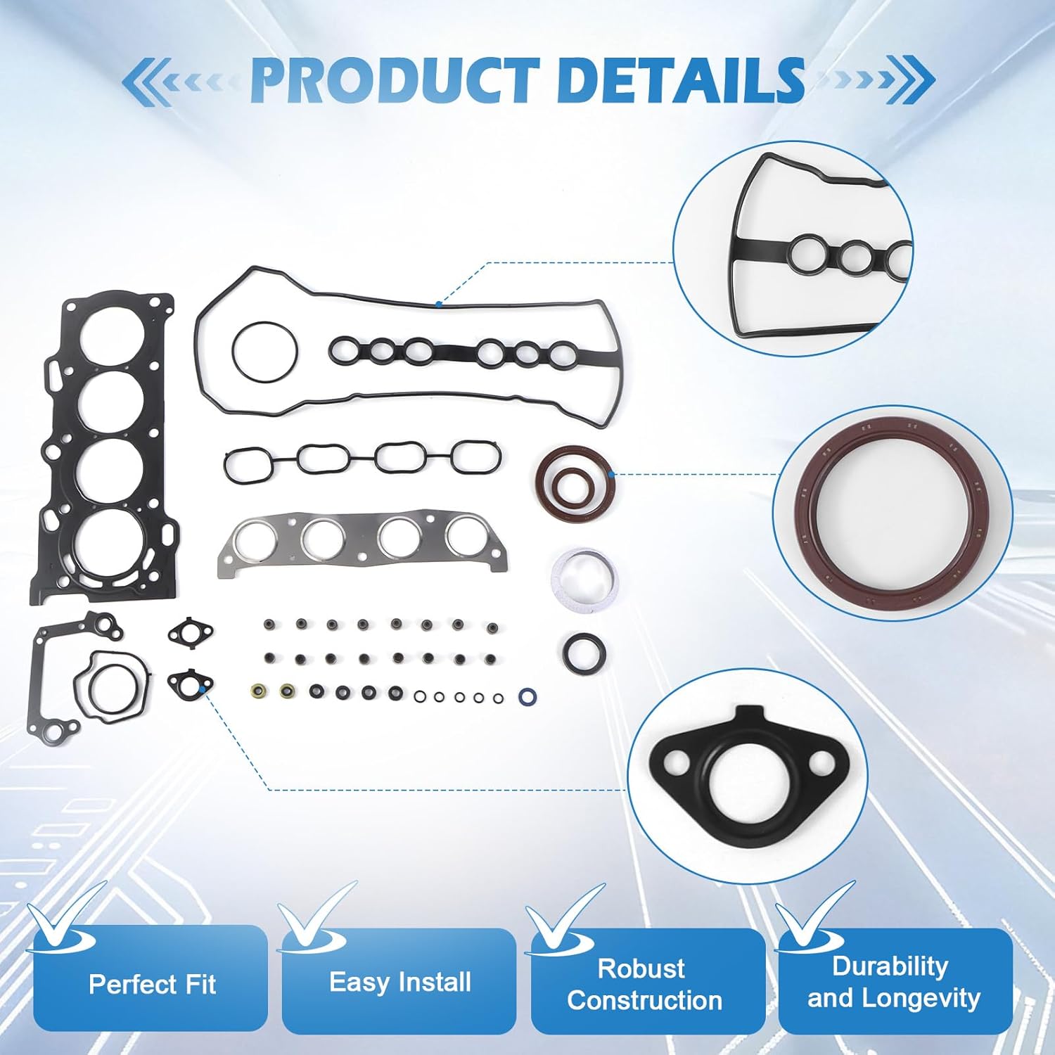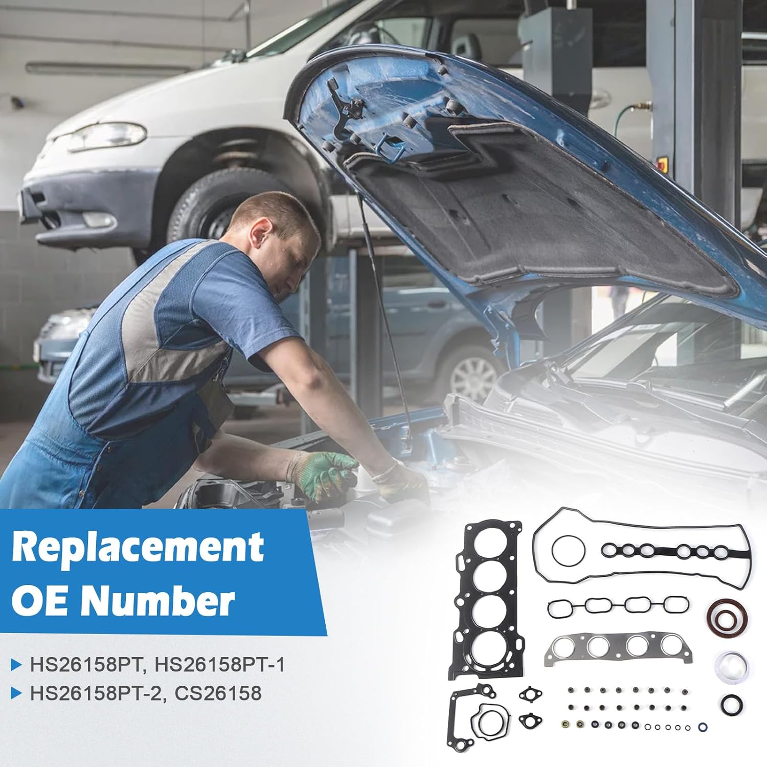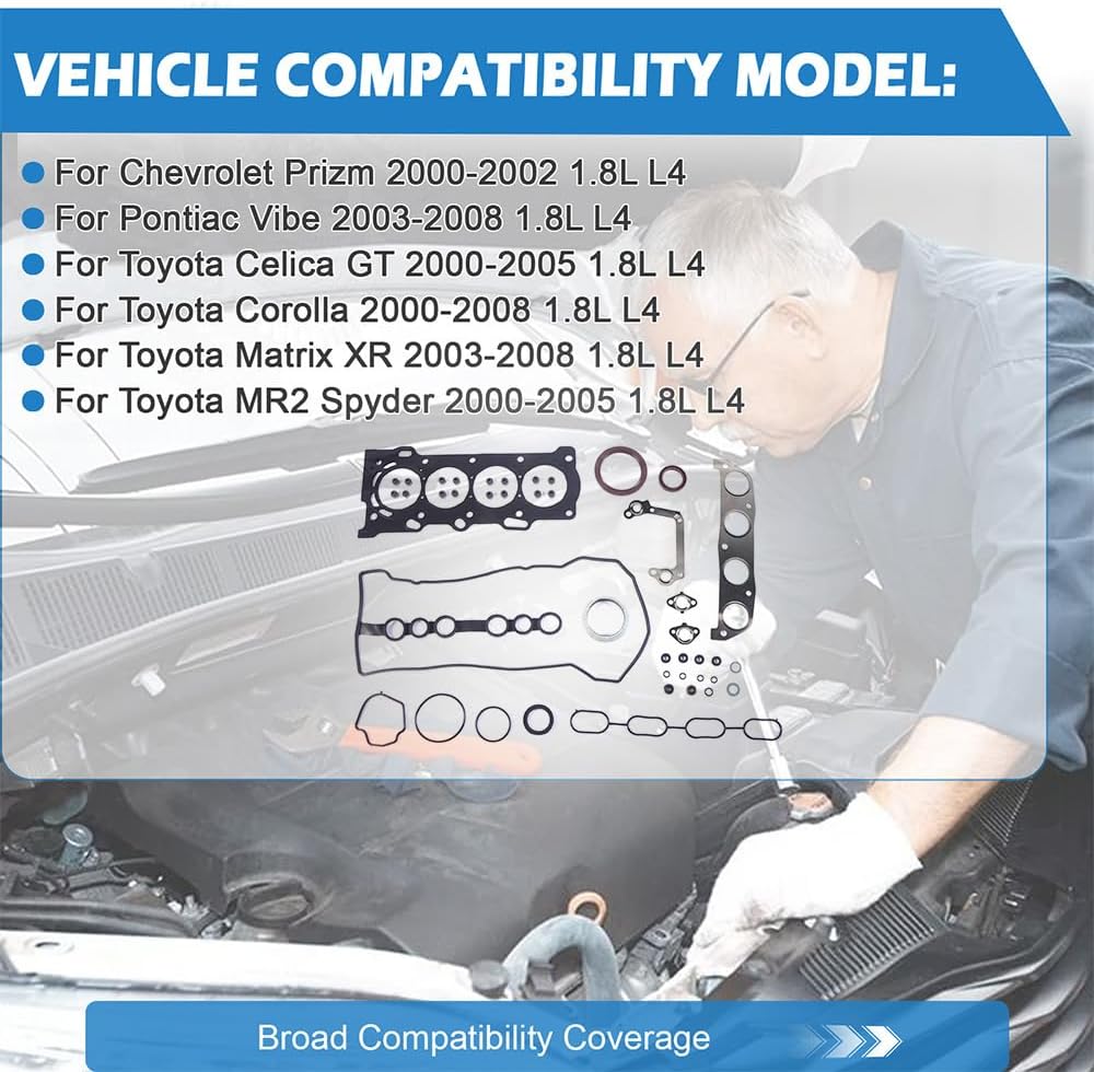 Engine Overhaul Gasket Seals Kit for Toyota Celica GT/Corolla/MR2 & Chevrolet Prizm/Vibe (2000-2008) | OE HS26158PT/CS26158 | 1.8L L4Product Features:● Precision-engineered to OE specifications, this engine overhaul gasket seals kit restores airtight sealing and lubrication flow, ensuring smooth engine operation and reducing oil leaks for your 1.8L L4 vehicles.● Manufactured using advanced international equipment and state-of-the-art technology, the gaskets are designed to maintain consistent performance under high-mileage and daily driving conditions, extending component lifespan.● Crafted with premium materials to resist heat, thermal expansion, and chemical wear, this kit delivers reliable sealing for critical engine components like the valvetrain, oil pan, and cylinder head.OE Replace Part Number:● HS26158PT, HS26158PT-1, HS26158PT-2, CS26158Compatible Models :● For Chevrolet Prizm (2000-2002) 1.8L L4● For Pontiac Vibe (2003-2008) 1.8L L4● For Toyota Celica GT (2000-2005) 1.8L L4● For Toyota Corolla (2000-2008) 1.8L L4● For Toyota Matrix XR (2003-2008) 1.8L L4● For Toyota MR2 Spyder (2000-2005) 1.8L L4Package Including:● 1 x Engine Overhaul Gasket Seals Kit for 1.8L L4 EnginesAttention:● Professional installation is strongly recommended to ensure proper gasket alignment and torque specs—incorrect installation may cause oil leaks or reduced engine performance.● Verify your vehicle’s model year and engine code using our Fitment Bar before purchase to confirm compatibility with your specific Toyota or Chevrolet model.● Inspect the gasket set for visible damage (e.g., tears, cracks) upon arrival; contact us immediately if you notice defects for a quick resolution.
